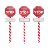 This festive octagonal "Santa please STOP Here" sign transforms your outdoor space into a magical Christmas destination. Standing at 75cm tall with a candy-cane striped stake in red and white, it delivers classic Christmas styling that catches every eye. The bold holiday typography paired with secondary directional plaques – featuring Sleigh Rides, Candy Lane, and Tinsel Town – creates a whimsical touch that delights visitors of all ages. The smooth painted finish showcases metallic gold-accented lettering for a premium look that elevates your holiday display beyond ordinary decorations.
