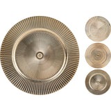 Versatility extends beyond the place setting – layer it under clear plates to amplify sparkle, cluster with candles for a radiant centrepiece, or mount as a wall accent for festive texture. The lightweight build makes repositioning simple – buyer handiwork may be required for hanging. Its polished gold–tone suits modern, classic and eclectic schemes alike, pairing easily with red, green, white or monochrome palettes. Use it to echo metallic accents in flatware, napkin rings and baubles for a coordinated finish. Available in assorted designs and colours, it helps you curate a consistent look across multiple tables or rooms. When the season ends, repurpose it for year–round styling on sideboards or consoles, where the ribbed pattern continues to catch and reflect ambient light. Ideal for hosts, stylists and venue decorators seeking instant impact with minimal effort, this 33cm charger plate offers reliable quality, elegant detail and festive lustre.