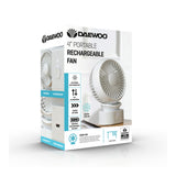This 4 inch portable rechargeable fan is built for convenient personal cooling wherever you need it most. Its compact desk fan design sits neatly on desks, tables and workspaces, making it a practical choice for home offices, study areas, bedside tables and small rooms where space matters. With 3 adjustable speed settings, you can fine tune airflow for light ventilation or stronger instant cool air performance when the temperature rises. The tilting fan head directs airflow up or down for targeted cooling, helping you stay comfortable without moving the whole unit. An 1800mAh rechargeable battery gives you cordless convenience, while the USB rechargeable design keeps charging simple and easy. A clear LED power light indicator shows operating and battery status at a glance, and the one button control keeps daily use straightforward. Finished in a clean, modern Daewoo style, it brings practical cooling and a tidy desktop look together in one compact unit.