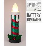 Create a warm Christmas focal point with the 60 cm green Collapsible Flickering LED Candle. A tall pillar silhouette and a lifelike flicker deliver cosy candlelight without flame or mess, while the dripping wax effect, red and green spiral stripes, and holly leaf and berry detail bring classic seasonal character to any setting. Battery operated for cordless placement, it suits homes where safety matters and style counts, offering glow that looks real yet remains cool to the touch. The collapsible body folds down for easy off season storage, so you can enjoy a statement centrepiece without bulky packing. Place it on the dining table, mantel or hallway console to elevate your Christmas décor with effortless elegance and reliable, low maintenance illumination.