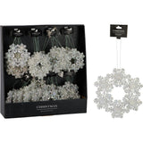 This 12 cm Christmas Snowflake Wreath Hanging Decoration in silver with iridescent glitter brings crisp, wintry sparkle to trees, doors, windows and gift wrap. Its intricate layered cutwork forms a balanced circular snowflake wreath, creating a delicate silhouette that catches light from every angle. Subtle pearlescent accents add a frosted finish, while the glitter coat reflects fairy lights for a bright, eye–catching glow. A pre–attached hanging cord makes placement quick and tidy, and the lightweight construction sits neatly without weighing down branches. Offered in assorted designs and colour tones, it adds varied visual interest across your display and blends easily with traditional and modern Christmas themes. Ready–to–use straight from the box, it delivers refined detail in a compact size that suits small trees as well as larger centrepieces.